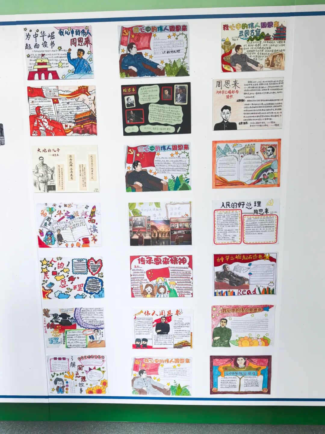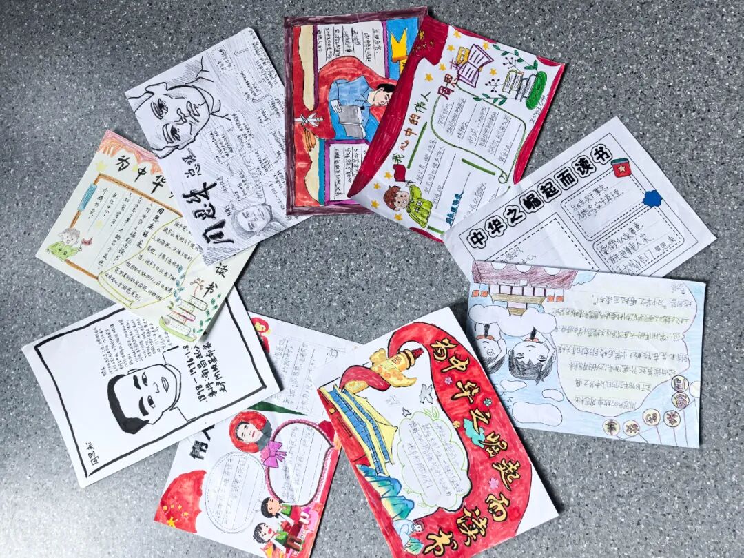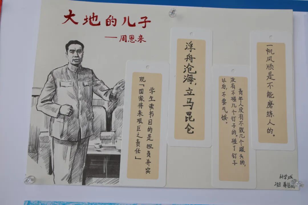 通过手抄报的形式,写下自己的感悟,彼此分享周恩来总理在学习工作中的故事,从中汲取智慧和力量。