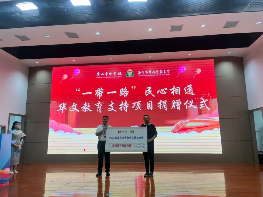 2025年9月12日上午,我会理事长沈清受邀参加了广西华侨学校2025年开学典礼,并在典礼上为该校捐赠项目资金475000元。广西华侨学校成立于1960年,是在周恩来总理的亲切关怀下建成,是一所以服务海外侨胞、培养华文教育师资为宗旨的重要学府。