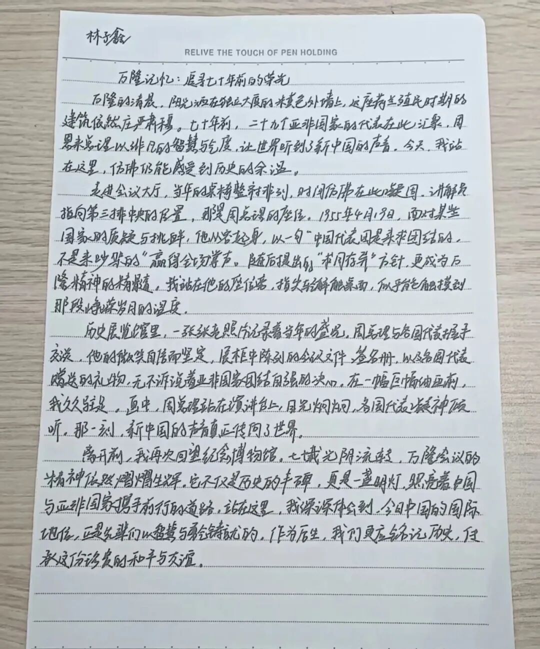“七十年前,二十九个亚非国家的代表在此汇聚,周总理以非凡的智慧与气度,让世界听到了新中国的声音,今天,我站在这里,仿佛仍能感受到历史的余温。”