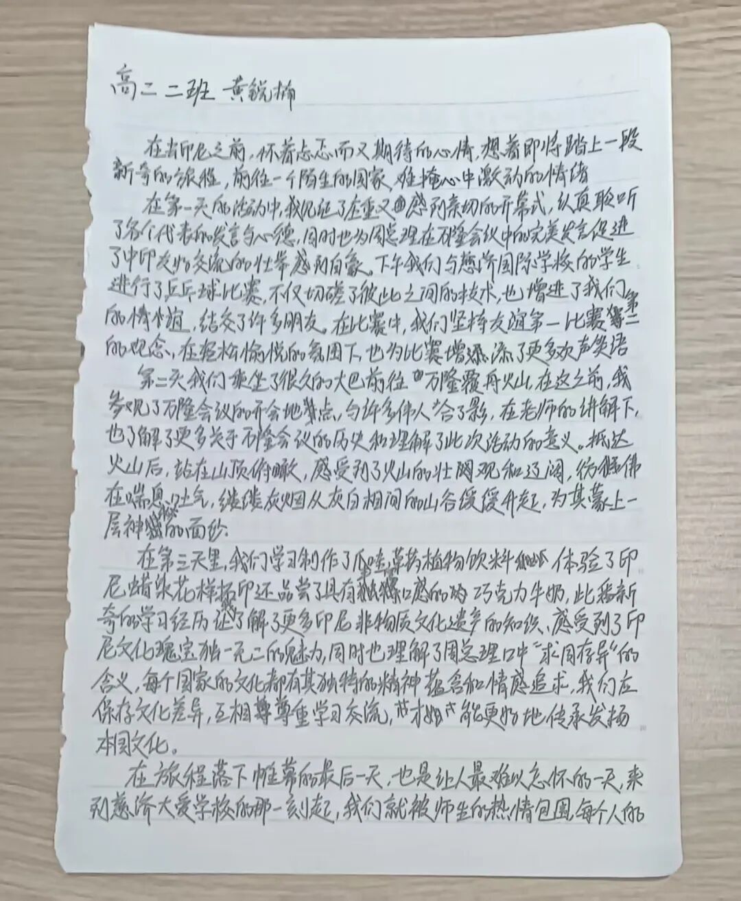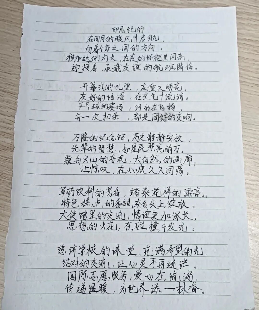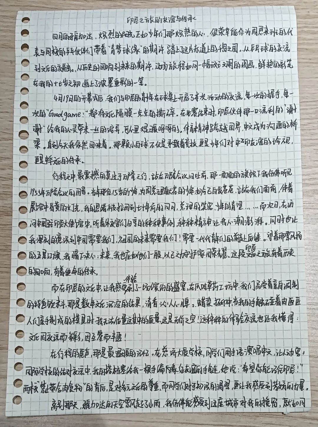 今年4月,我会联合中国—东盟中心、周恩来邓颖超纪念馆、中国友好和平发展基金会、北京同心圆慈善基金会共同主办的“青梦球缘—周恩来与万隆会议图片展暨中国—东盟(印尼)青少年乒乓球研修营”,带领德阳巴川中学“周恩来班”的12名学子踏上了前往印尼的跨国之旅。5天的时间里,他们在异国他乡留下了青春的足迹,收获了宝贵的经历后,带着满满的感悟回到了熟悉的校园,纷纷写下了此次的所见所闻、所思所感,分享此次印尼之行。