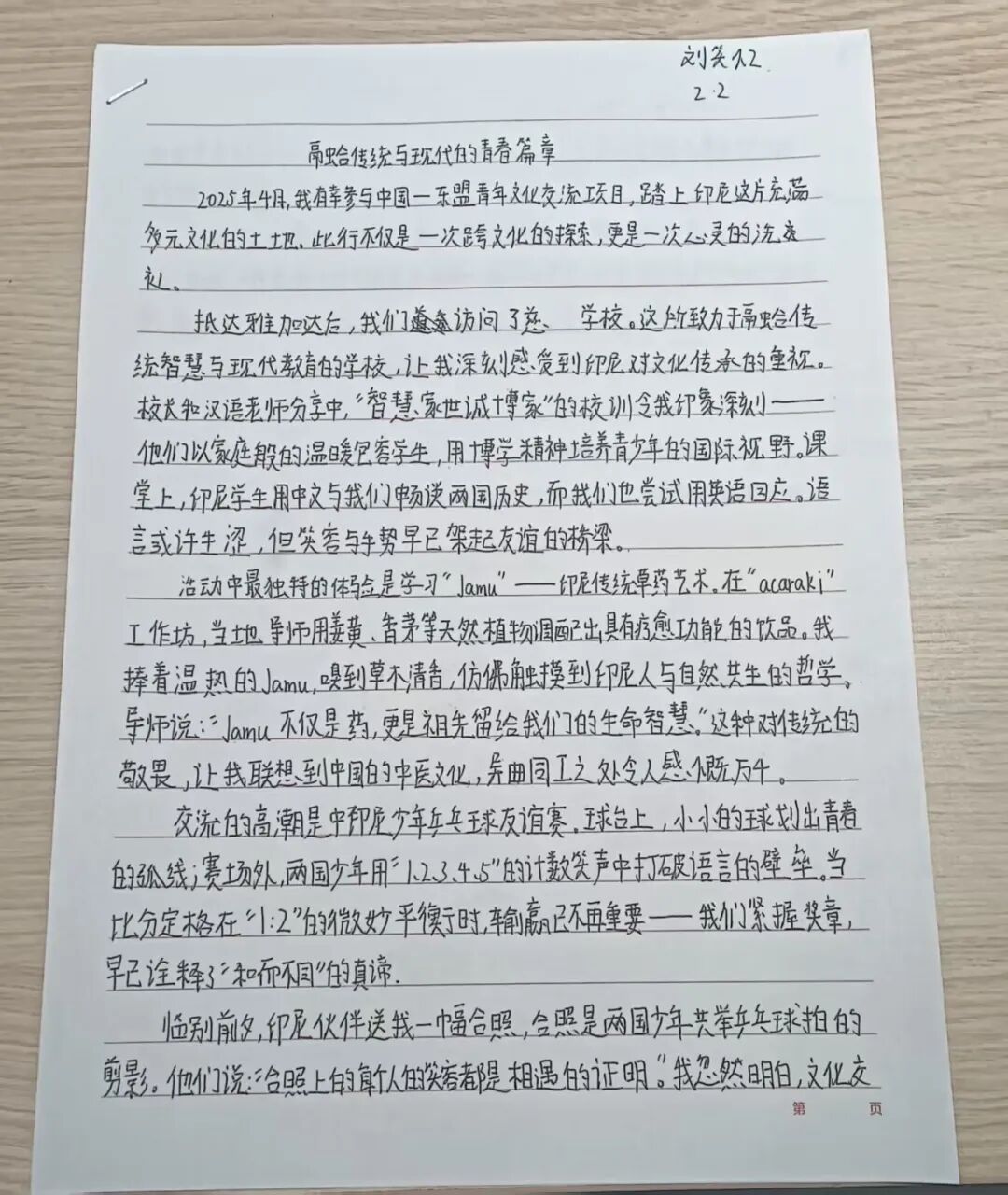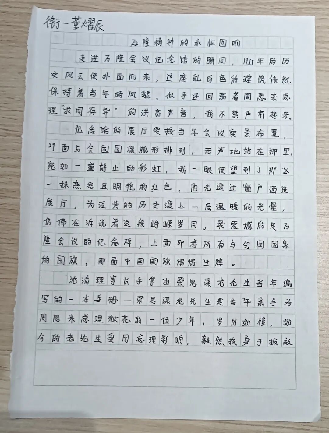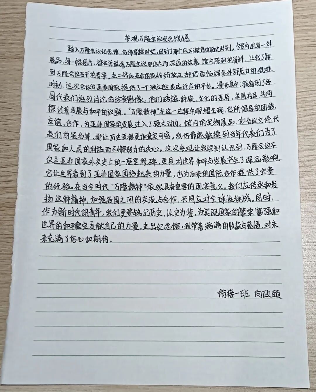 “参观完万隆会议旧址后,坐在大巴车上,我的脑海里响荡着万隆会议精神永恒不变的呼唤,想起那排列整齐的29面与会国国旗中属于我们的国旗,想起‘献花男孩‘梁思谋先生编写的那本手册,更加坚定自己作为青少年的使命感。”