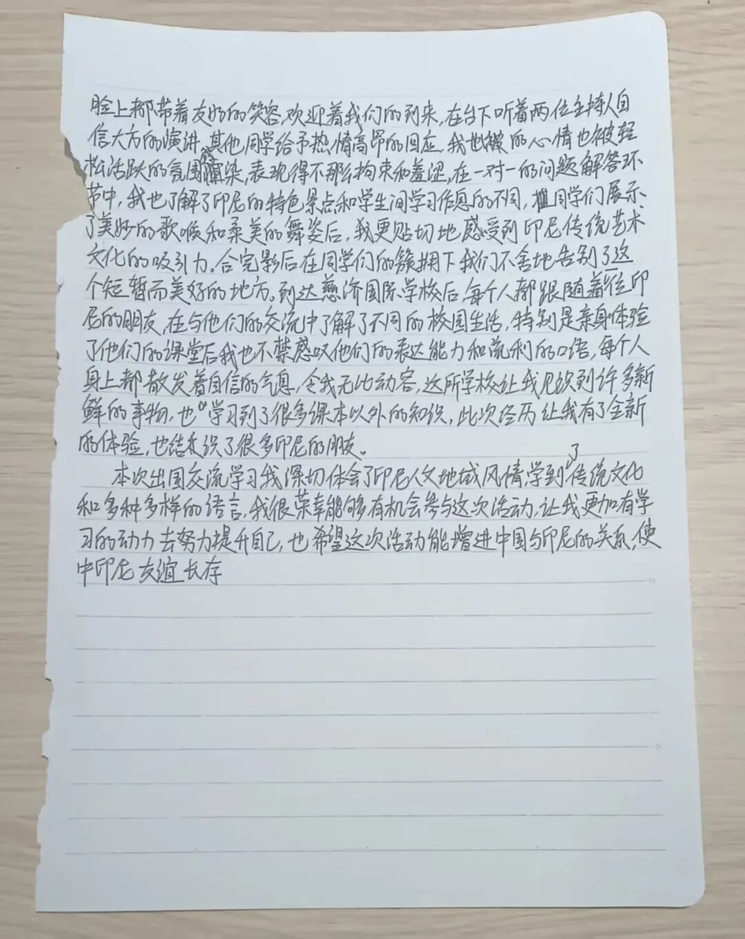 临别前夕,刘笑忆同学收到了印尼伙伴送他的合照,合照上是两国少年共举乒乓球拍的剪影,印尼的小伙伴对他说“合照上每个人的笑容都是相遇的证明”。这也使得刘笑忆明白文化交流的意义如同一份拼图,差异是斑斓的碎片,而理解与尊重能将他们拼成完整的风景。