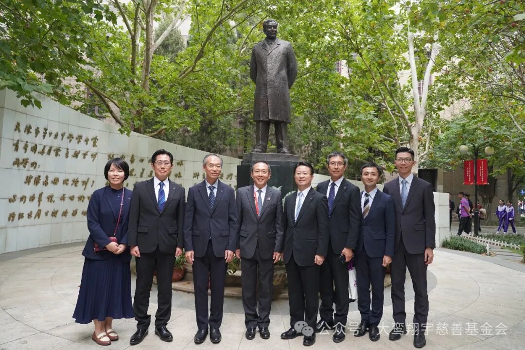 【上图,沈清理事长与日本创价学园访华团在南开中学周恩来雕塑下合影】