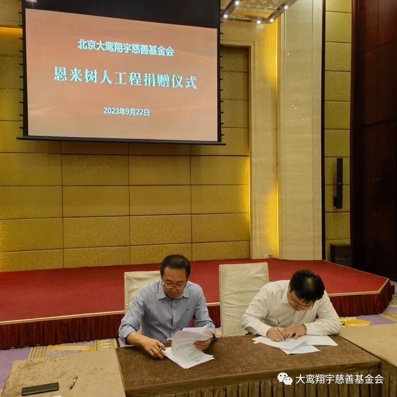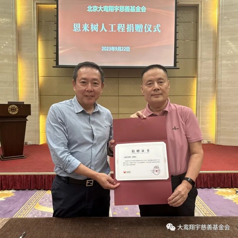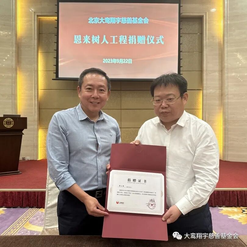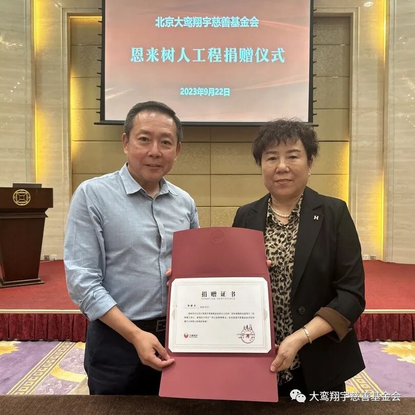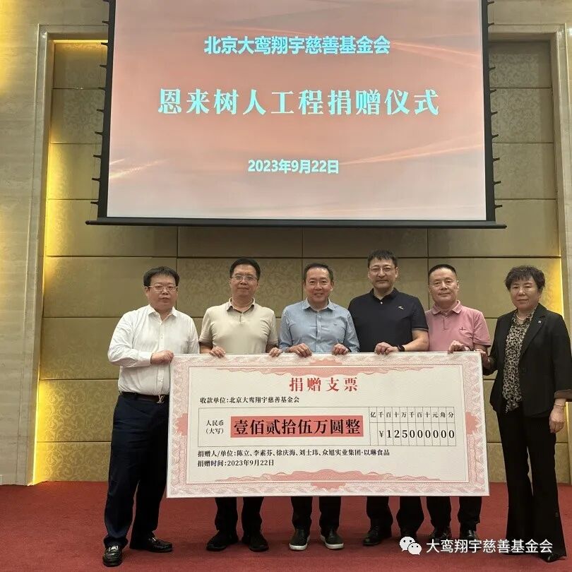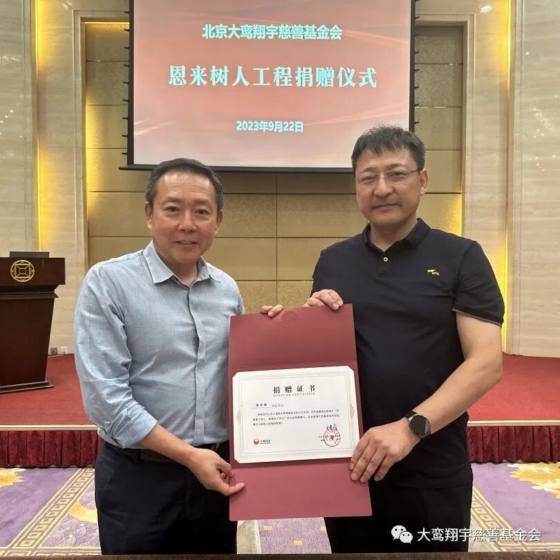 9月22日,北京大鸾翔宇慈善基金会“恩来树人工程”捐赠仪式在北京市朝阳区建国门外大街8号国际财源中心 A 座6层会议室举行,南开大学爱心校友陈立、河北建筑设计研究院常务副总经理徐庆海、石家庄市和合化肥化工有限公司董事长刘军强、无极人和医院董事长李素芬、河北众旭实业集团有限公司董事长李振杰五位爱心企业家向“恩来树人工程”共同捐赠125万元。