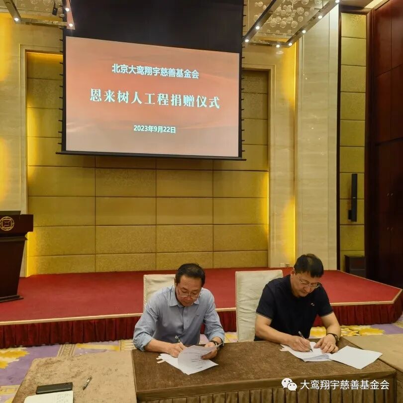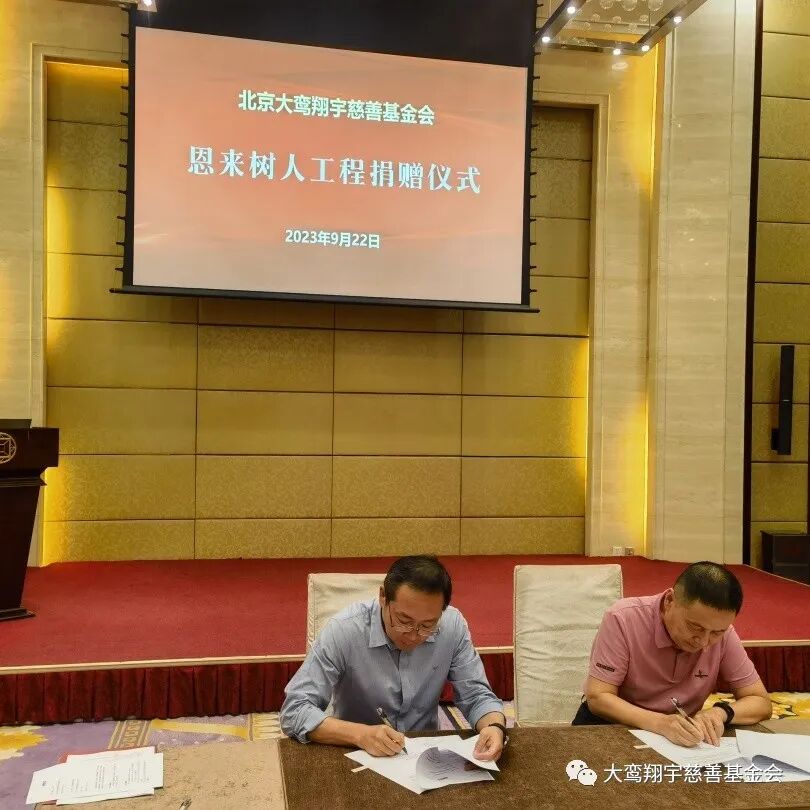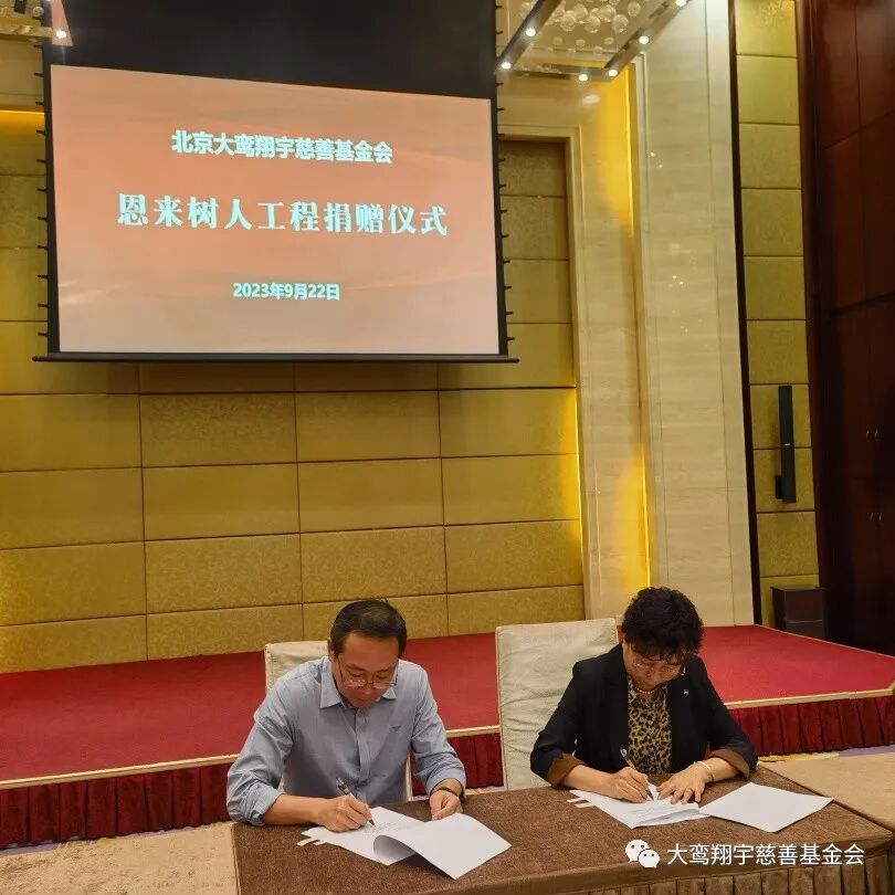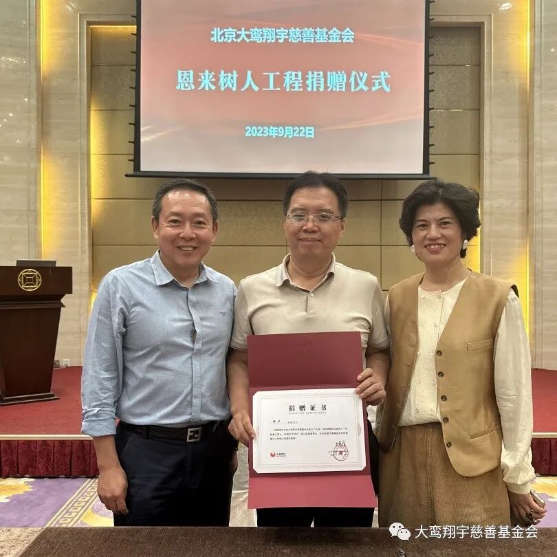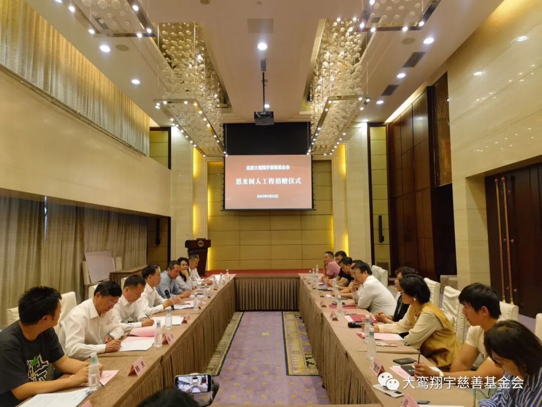 9月22日,北京大鸾翔宇慈善基金会“恩来树人工程”捐赠仪式在北京市朝阳区建国门外大街8号国际财源中心 A 座6层会议室举行,南开大学爱心校友陈立、河北建筑设计研究院常务副总经理徐庆海、石家庄市和合化肥化工有限公司董事长刘军强、无极人和医院董事长李素芬、河北众旭实业集团有限公司董事长李振杰五位爱心企业家向“恩来树人工程”共同捐赠125万元。