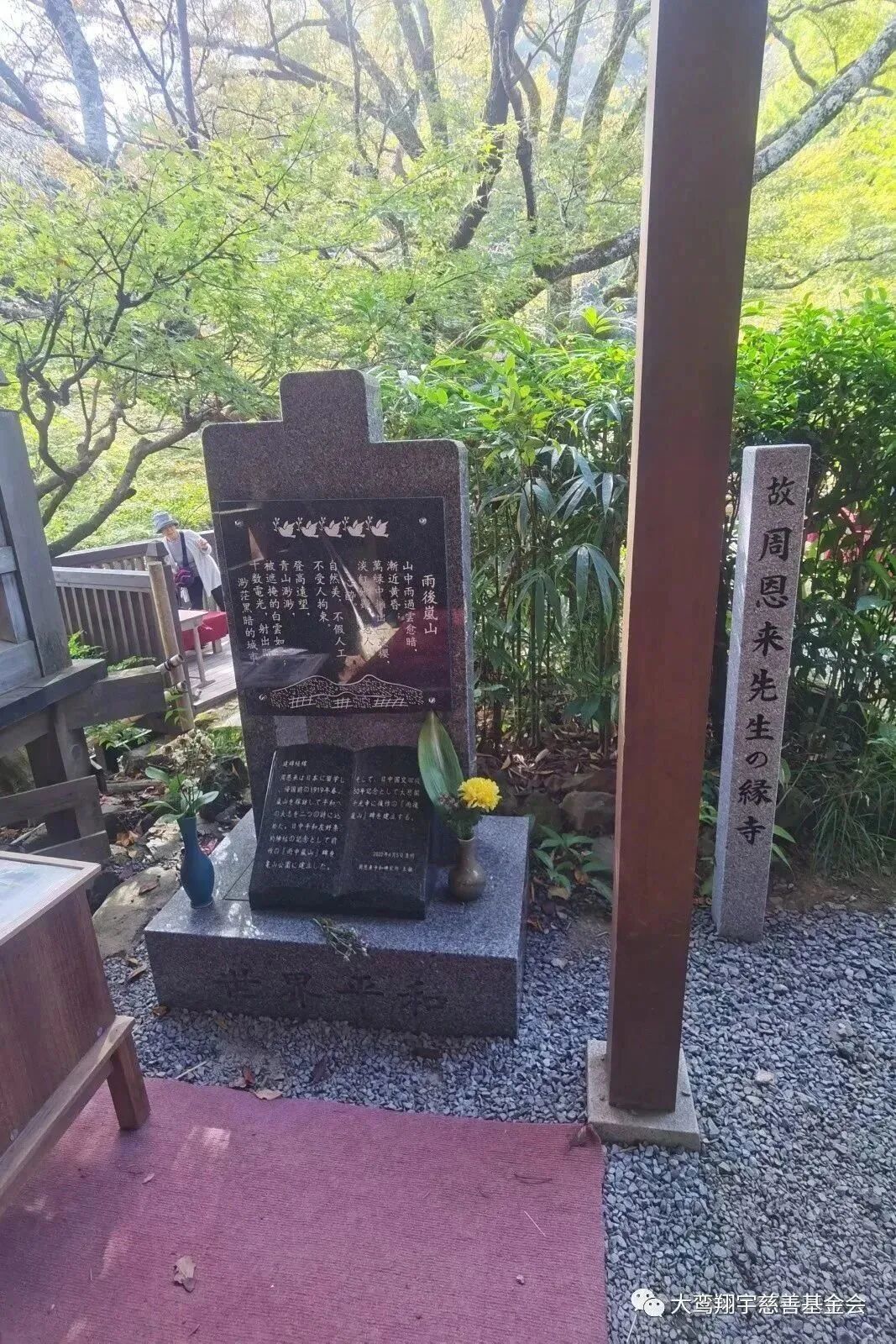 “雨中二次游岚山,两岸苍松夹着几株樱。到尽处突见一山高,流出泉水绿如许,绕石照人。潇潇雨雾濛浓;一线阳光穿云出,愈见娇妍。人间的万象真理,愈求愈模糊;模糊中偶然见着一点光明,真愈觉娇妍。”这是周恩来总理于1919年创作的《雨中岚山》诗作。公益团队此行还特别前往京都瞻仰为纪念周恩来总理所立的《雨中岚山》诗碑,诗碑于1979年4月落成。随后瞻仰了于2022年4月落成的《雨后岚山》诗碑。两座诗碑至今屹立在岚山,隔河而立,周围绿树环绕,在蓝天、白云和明媚的阳光的映衬下,格外静谧、肃穆。不时有微风轻轻吹过,带走了所有阴霾,只留下温暖,一切尽可期待。