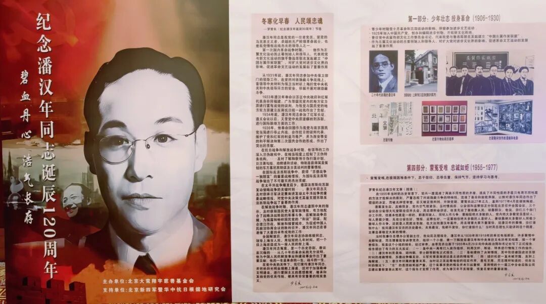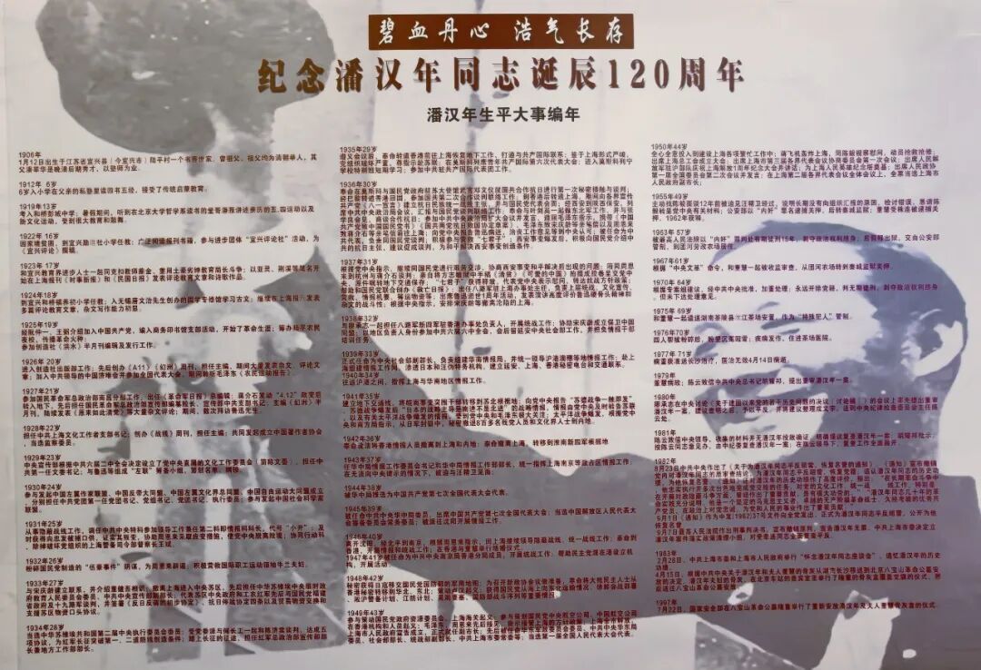 会议现场一侧展板,陈列着纪念潘汉年同志生平事迹,吸引着与会者驻足:珍贵的历史图片和资料中有他年轻时候与鲁迅等一起创建左联的时英姿;有他在建设上海时运筹帷幄的身影;也有他晚年饱经风霜却目光如炬的面容。这位1906年出生在江苏省宜兴县的革命家,用他71年的人生谱写了一曲“碧血丹心 浩气长存”的忠诚之歌。