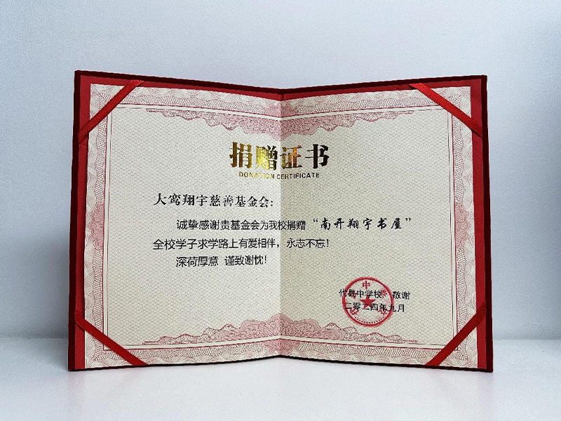 详情:北京大鸾翔宇慈善基金会为支持山西省代县中学”周恩来班“创建,为该校捐赠书籍1500余册,为表感谢,代县中学回赠感谢证书。