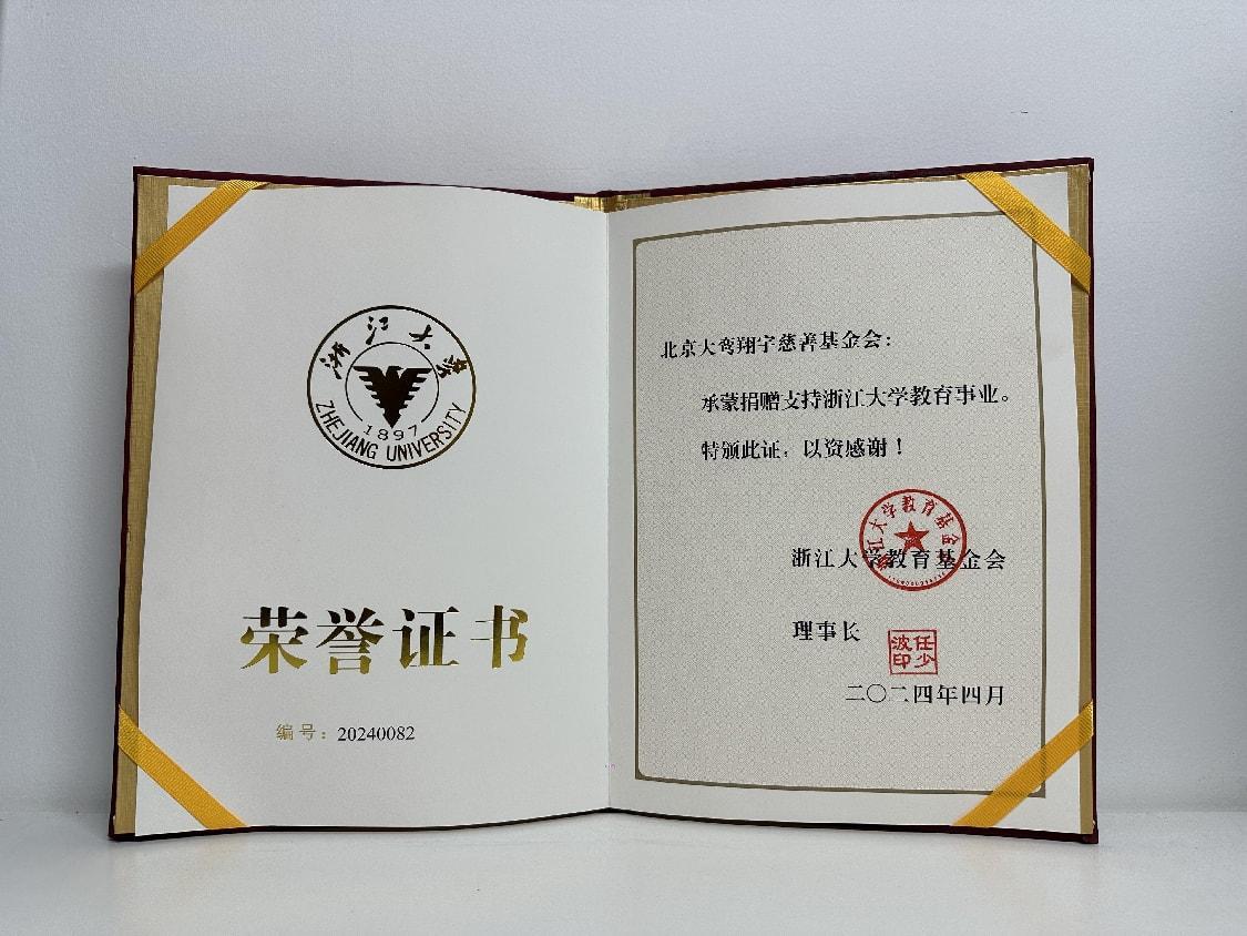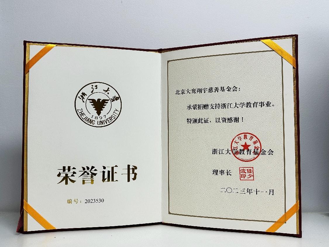 详情:浙江大学教育基金会致谢北京大鸾翔宇慈善基金会捐资助教,特此颁发荣誉证书以表感谢。