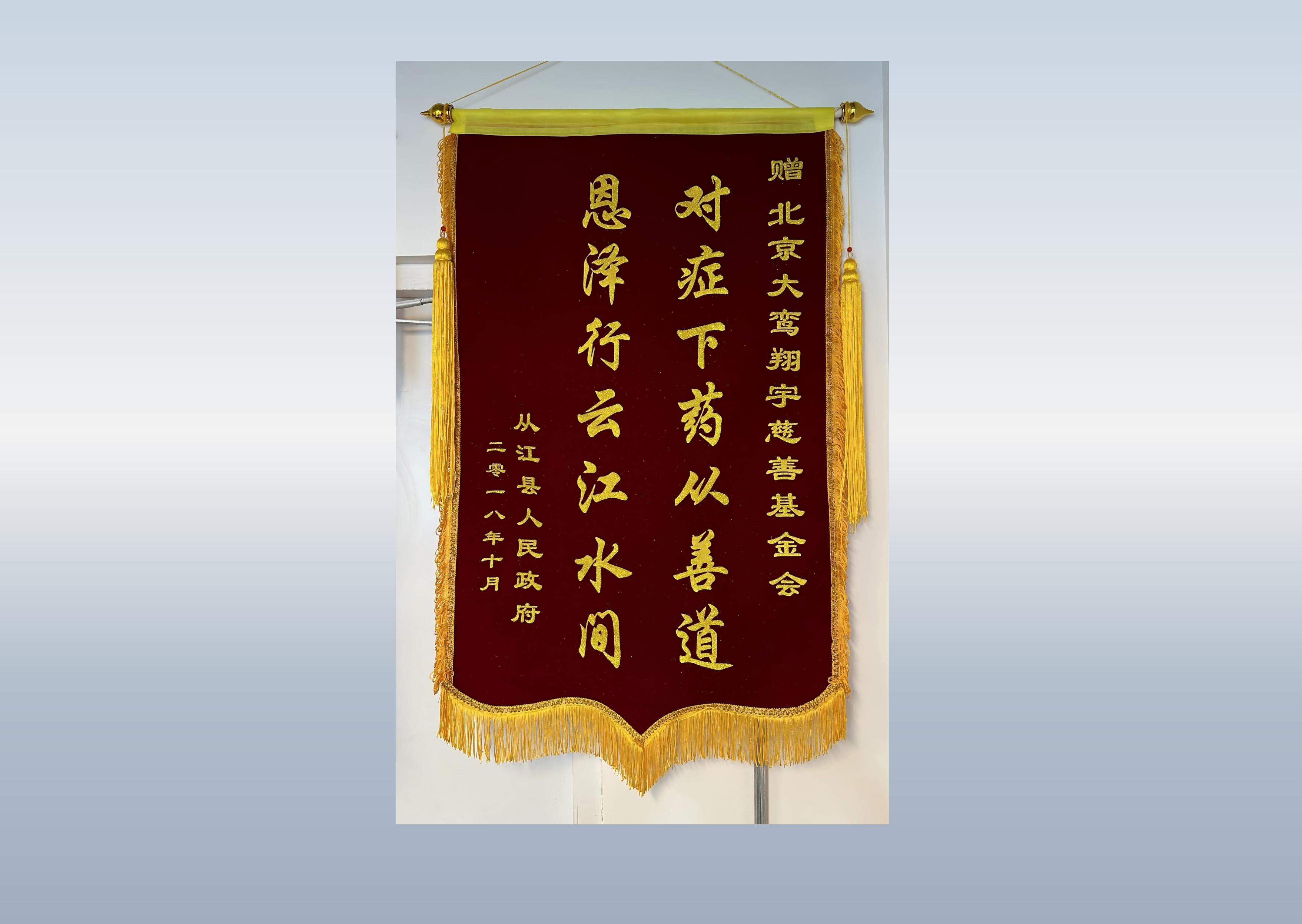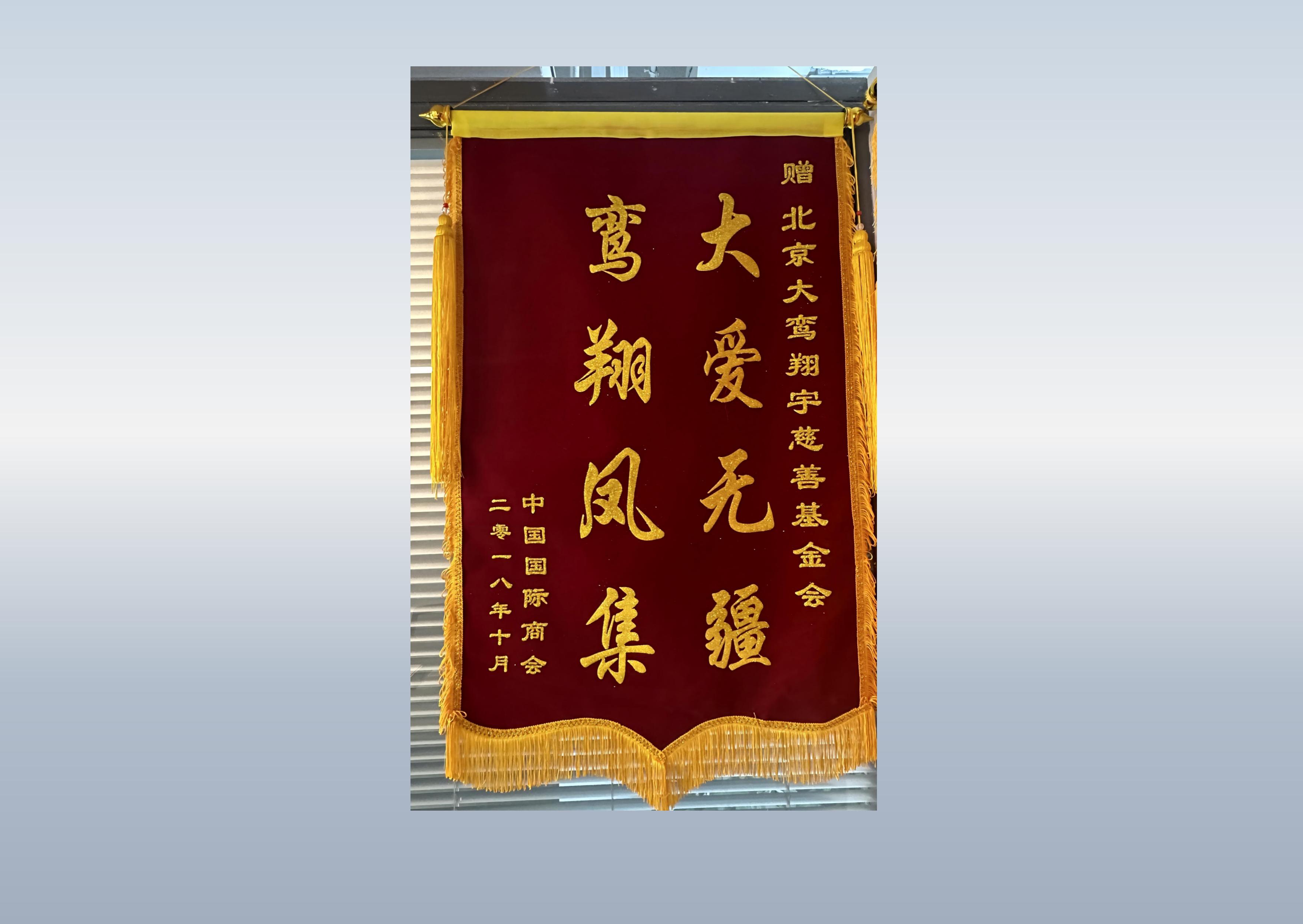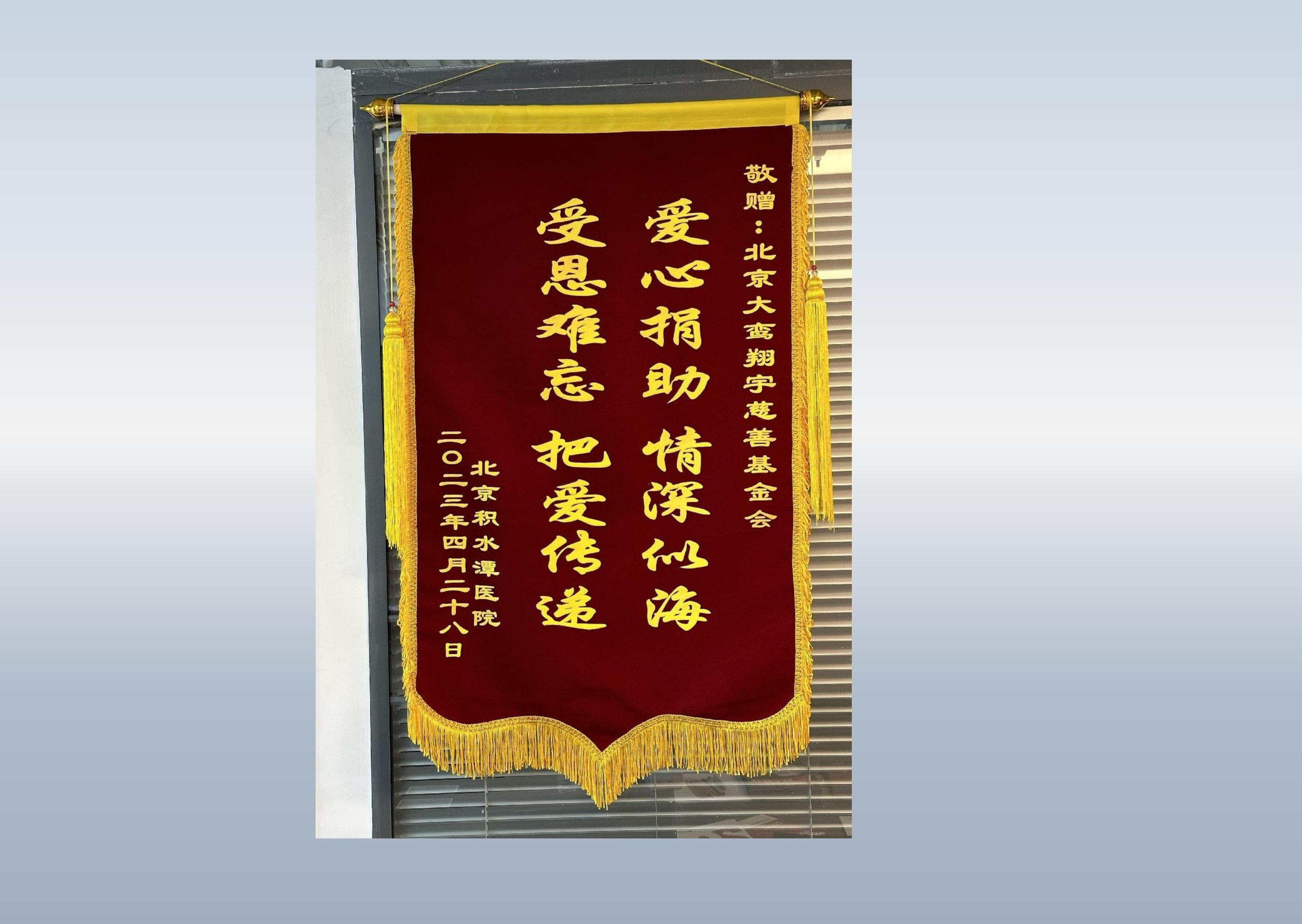 详情:北京积水潭医院为感谢北京大鸾翔宇慈善基金会的捐赠,回赠锦旗一枚。