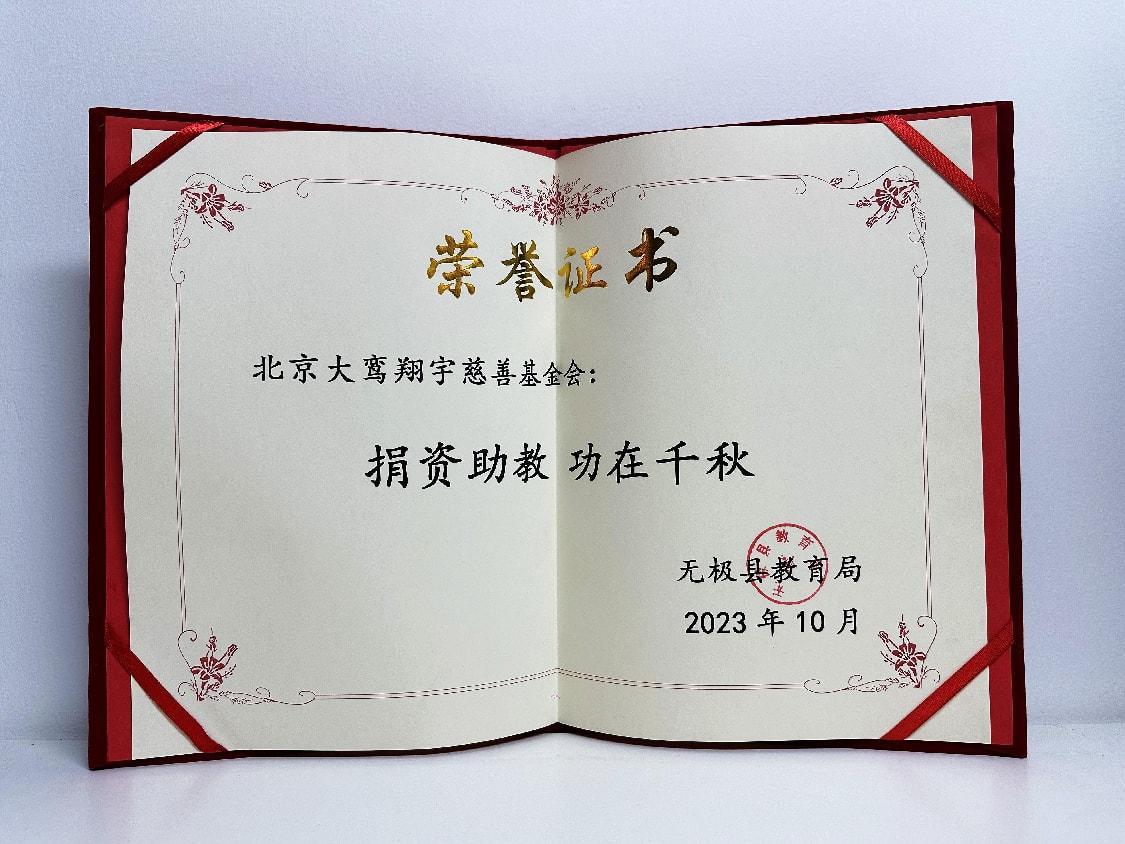 详情:无极县教育局为致谢北京大鸾翔宇慈善基金会捐资助教,特颁此荣誉证书以表敬意。