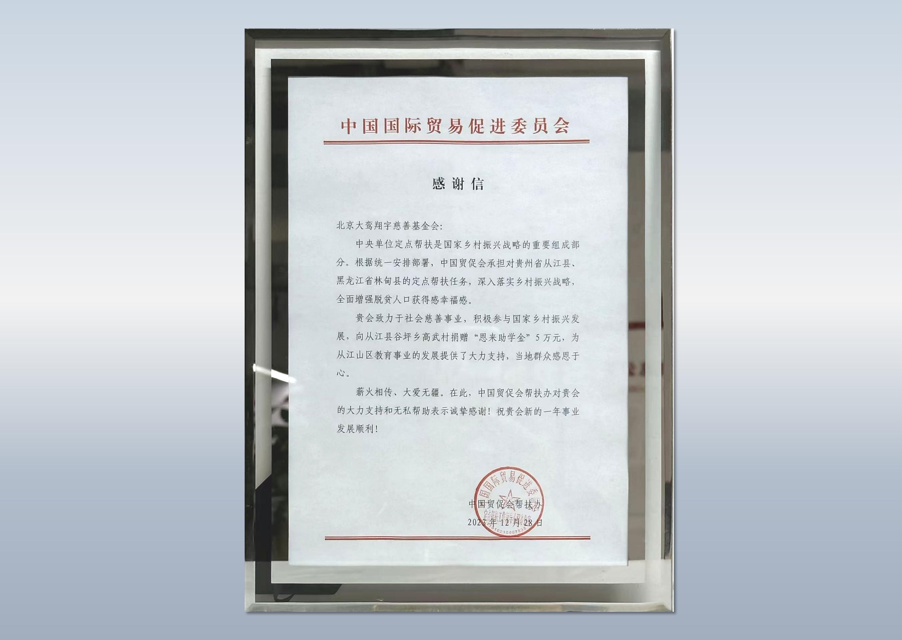 详情:中国贸促会承担对贵州省从江县、黑龙江省林甸县的定点帮扶任务,感谢北京大鸾翔宇慈善基金会对从江山区教育事业的发展的支持,特致信表示感谢。