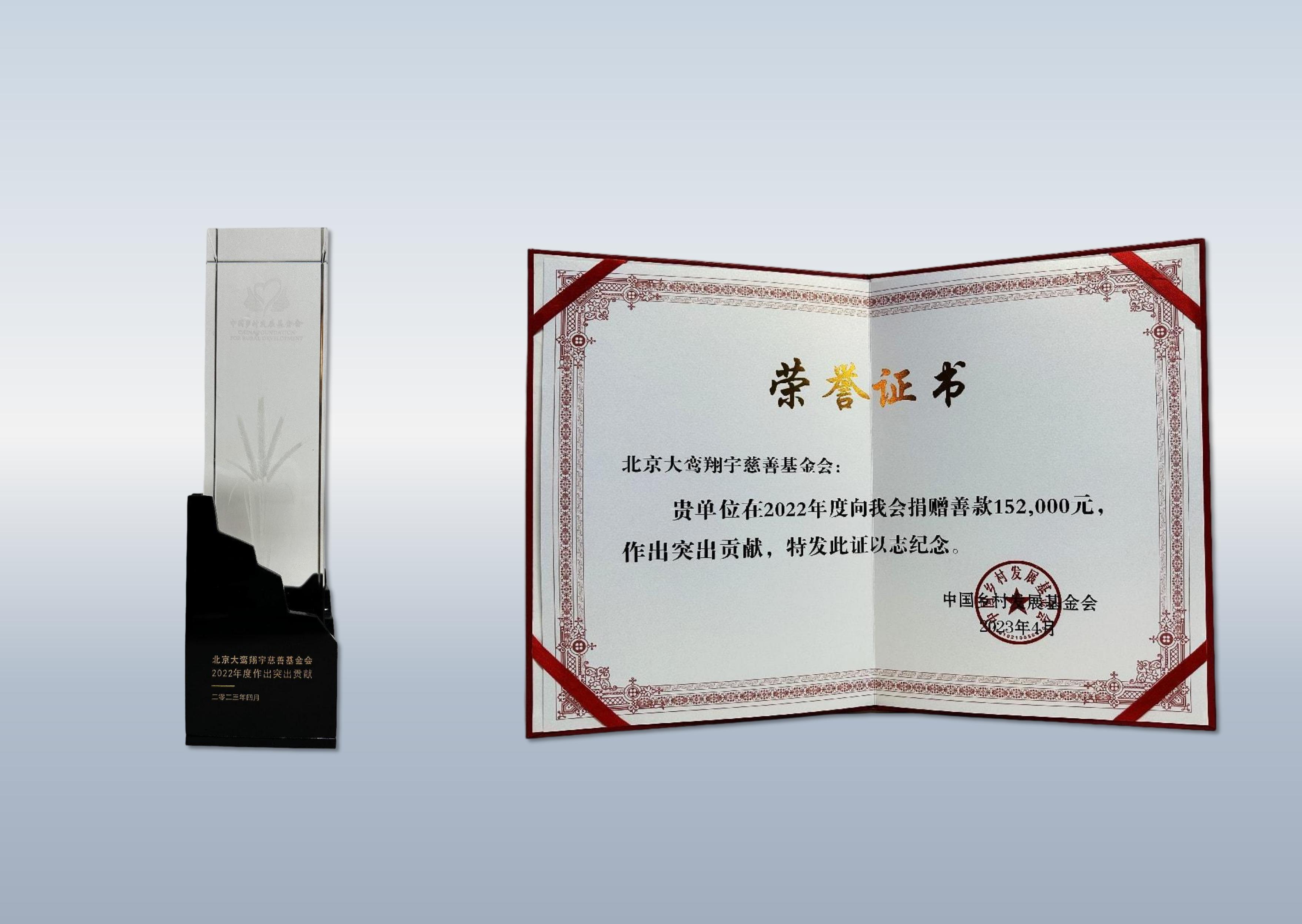 详情:中国乡村发展基金会为感谢北京大鸾翔宇慈善基金会捐赠,为公益慈善作出突出贡献,特颁发2022年度荣誉证书及奖杯。