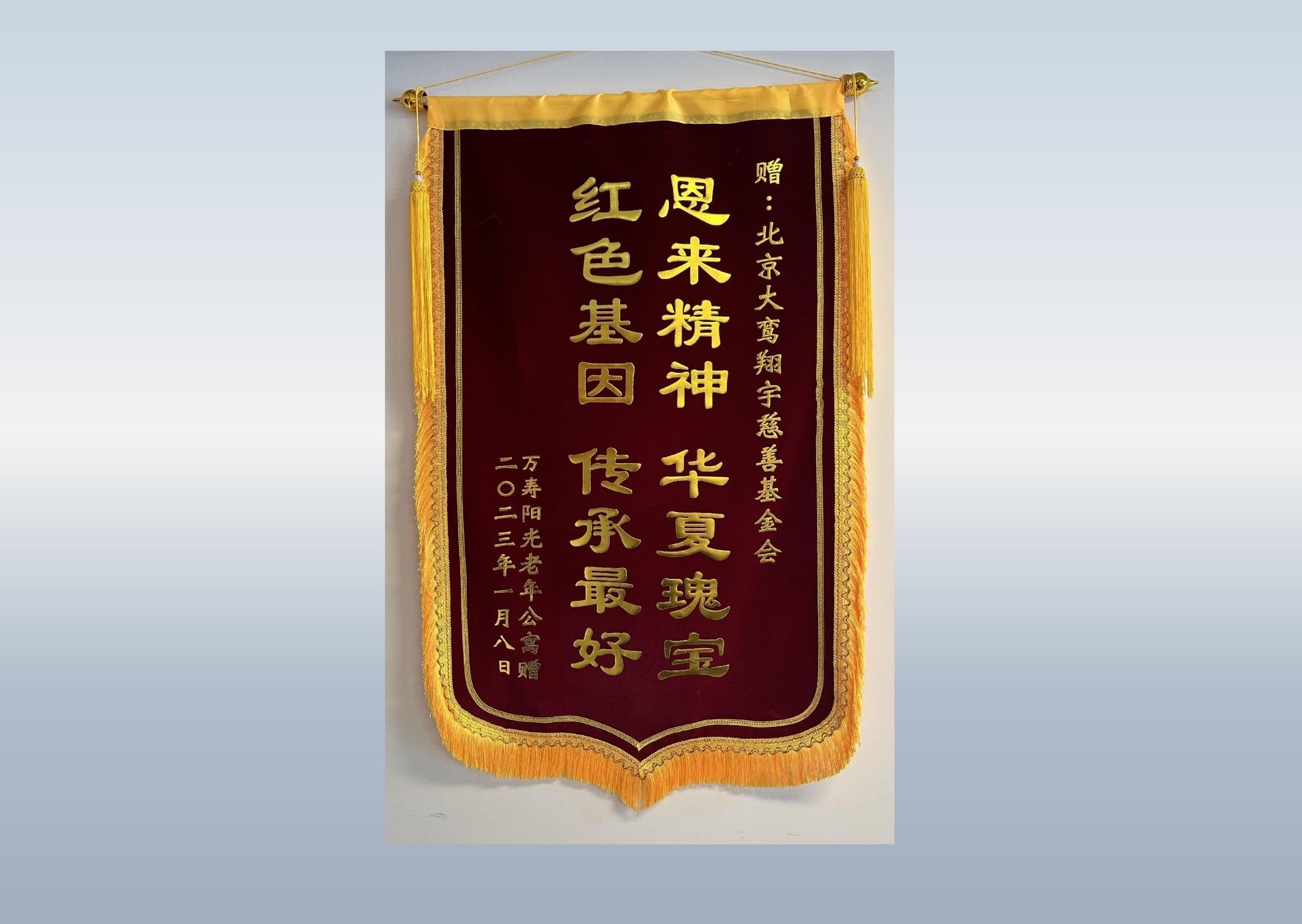 详情:理事长沈清带领北京大鸾翔宇慈善基金会员工及物资,前往万寿阳光老年公寓慰问公寓老人。为表感谢,万寿阳光老年公寓赠送锦旗一枚。