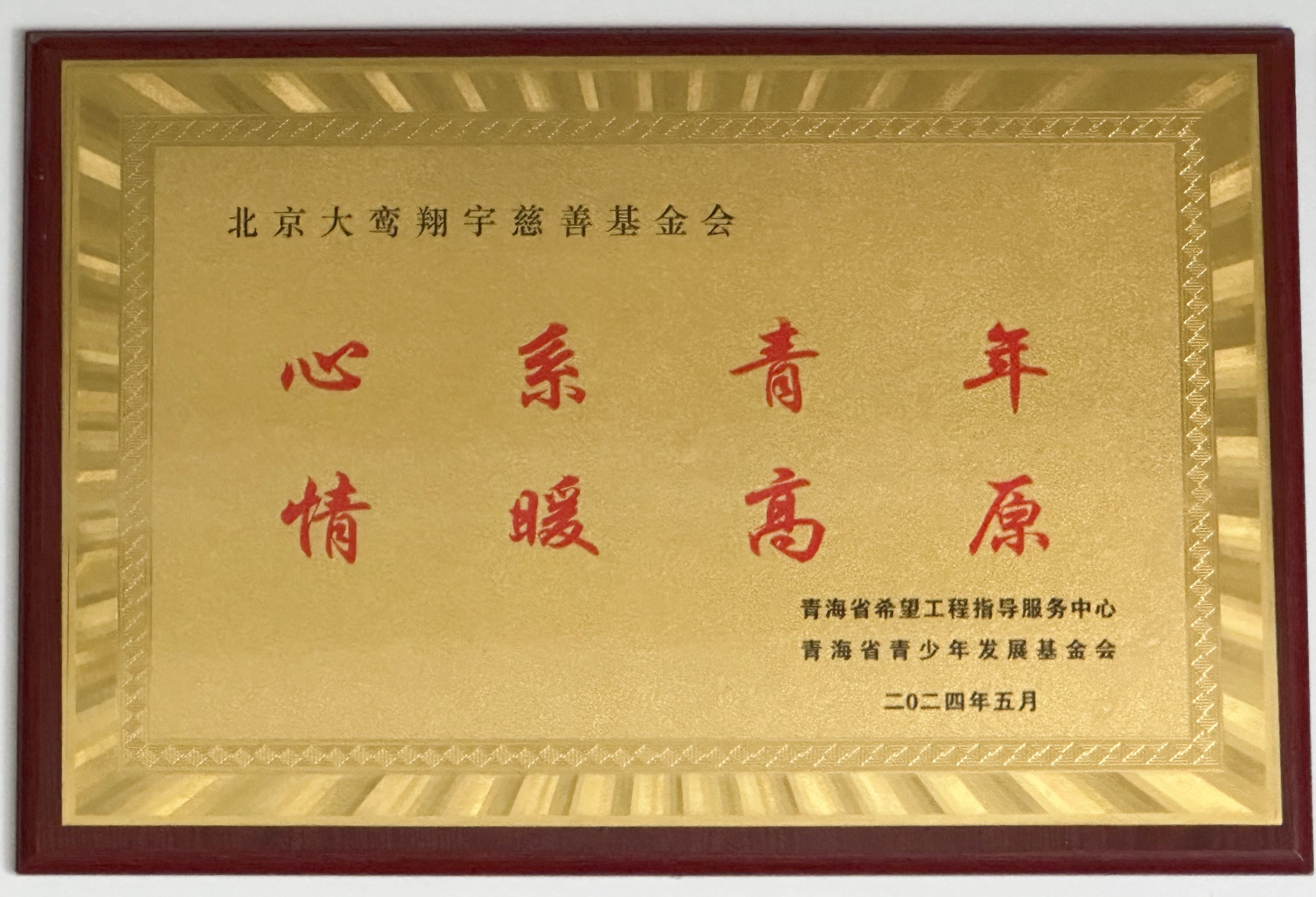 “心系青年,情暖高原”荣誉牌匾