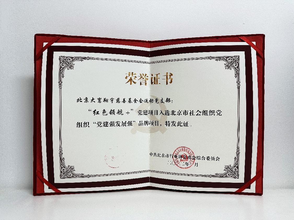 详情:北京大鸾翔宇慈善基金会“红色领航+”党建项目入选北京市社会组织党组织“党建强发展强”品牌项目,特发此荣誉证书。
