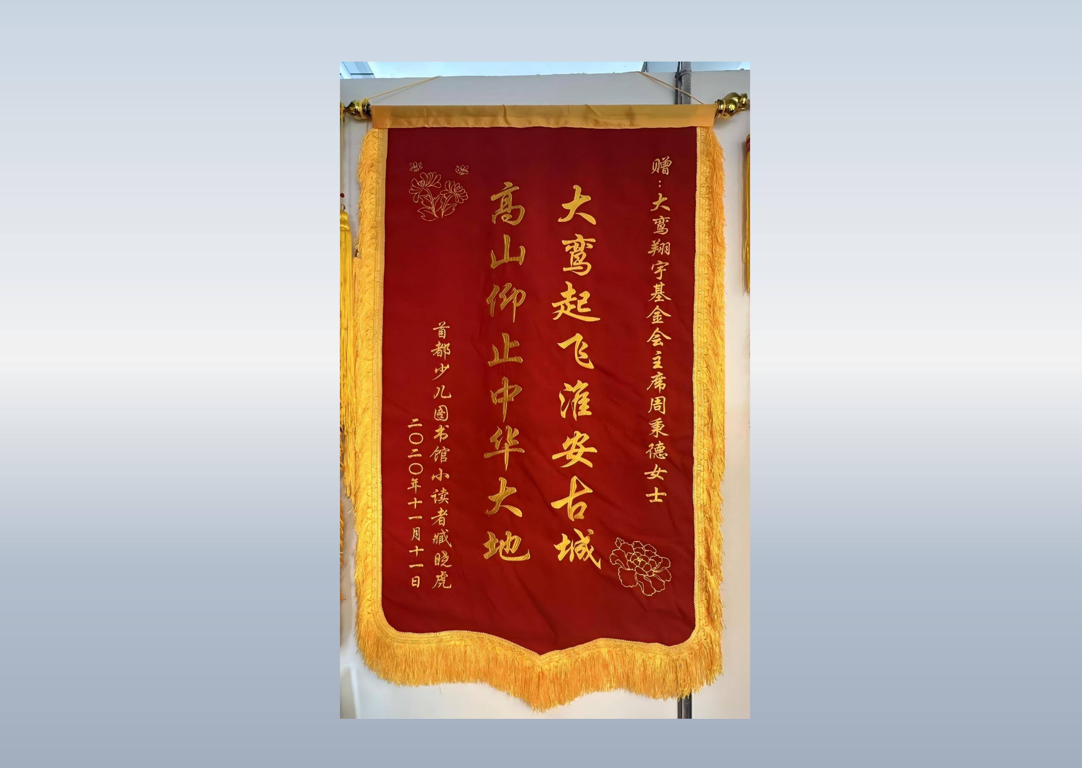 详情:首都少儿图书馆小读者臧晓虎,向北京大鸾翔宇慈善基金会周秉德会长敬赠锦旗一枚。