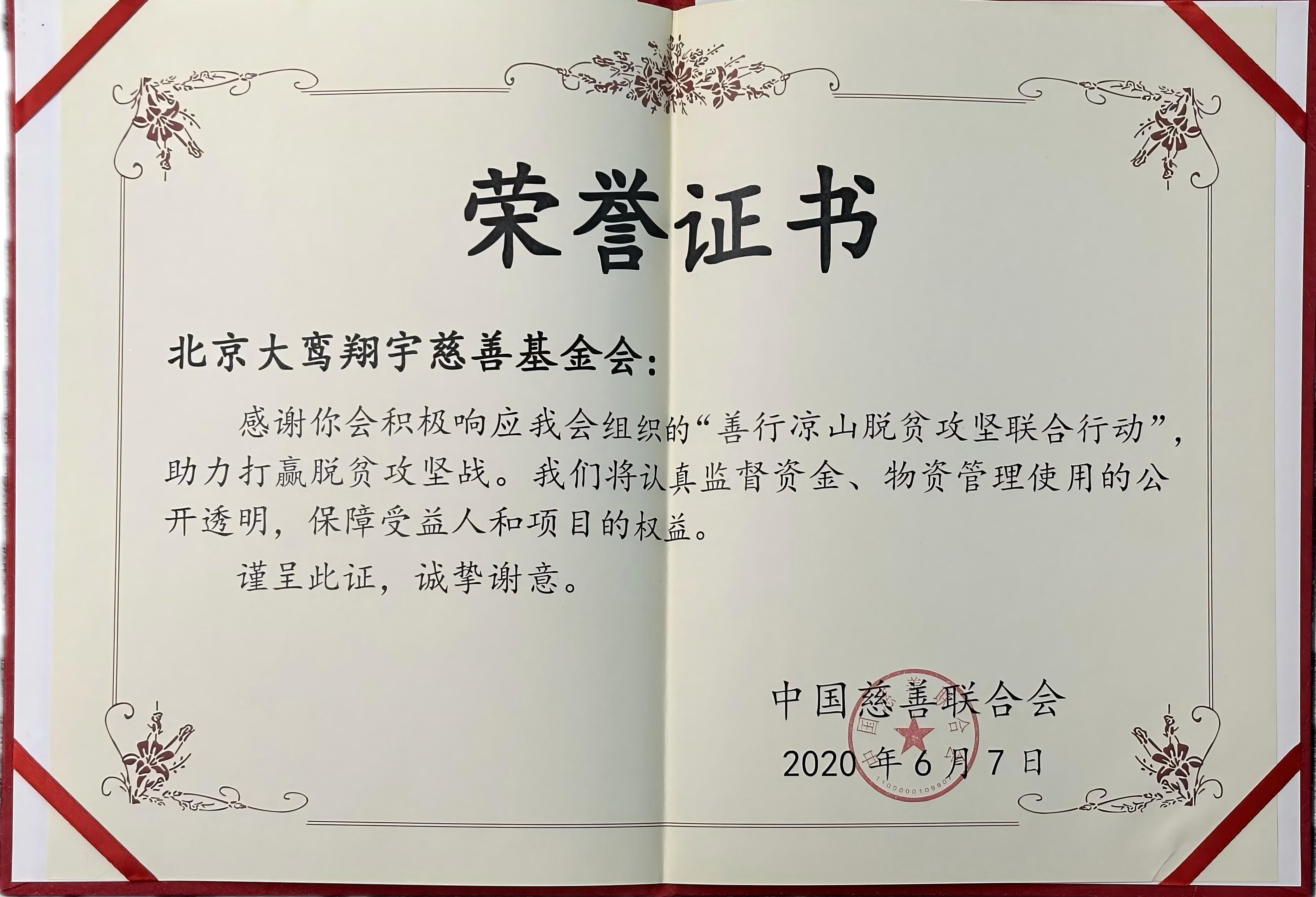 “善行凉山脱贫攻坚联合行动”荣誉证书