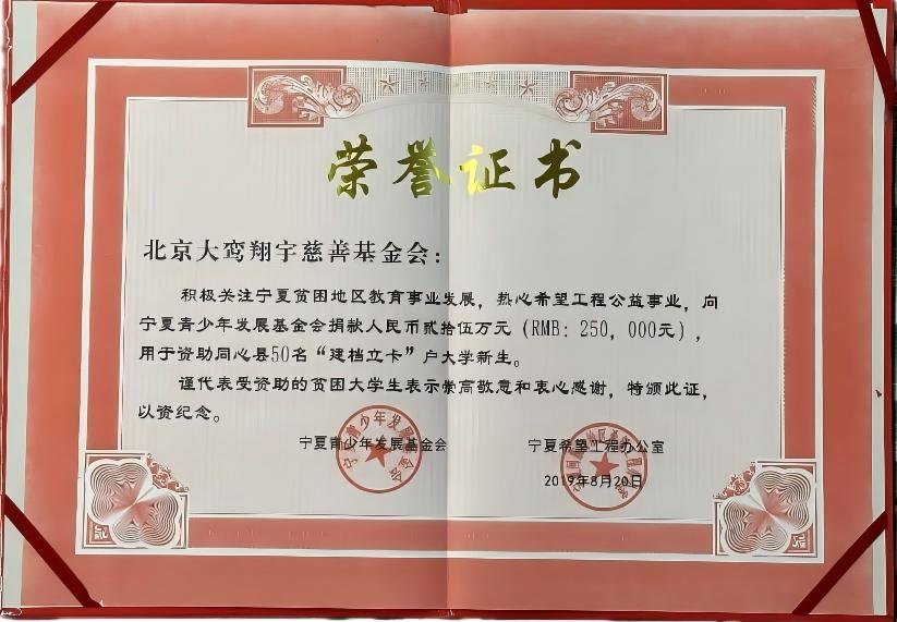颁发单位:宁夏青少年发展基金会、宁夏希望工程办公室