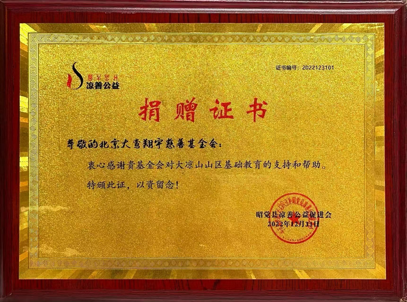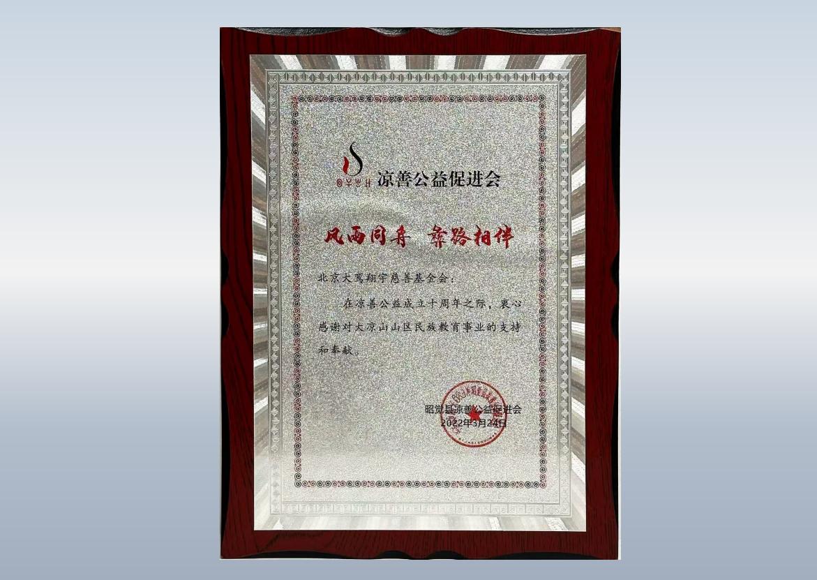 详情:凉善公益,为感谢北京大鸾翔宇慈善基金会对大凉山山区民族教育事业的支持,赠送感谢证书。