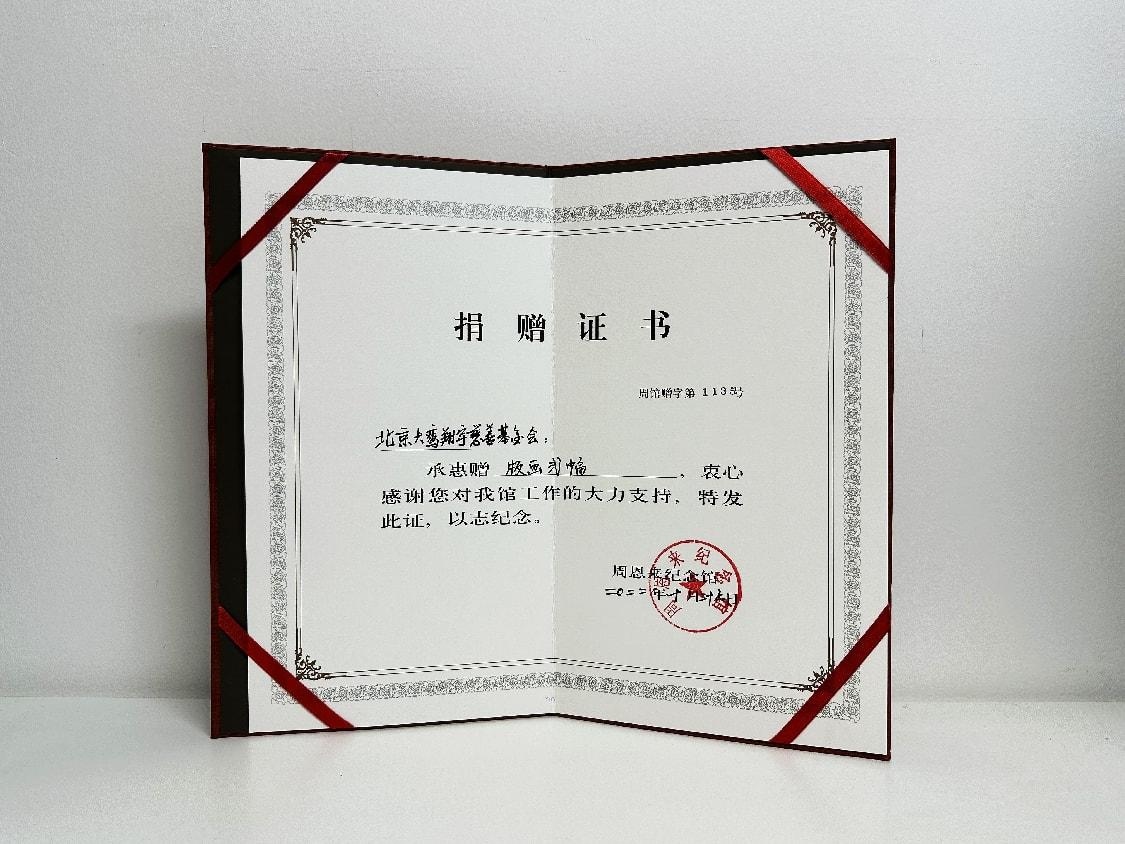 详情:北京大鸾翔宇慈善基金会向周恩来纪念馆捐赠版画,为表感谢,颁发捐赠证书。