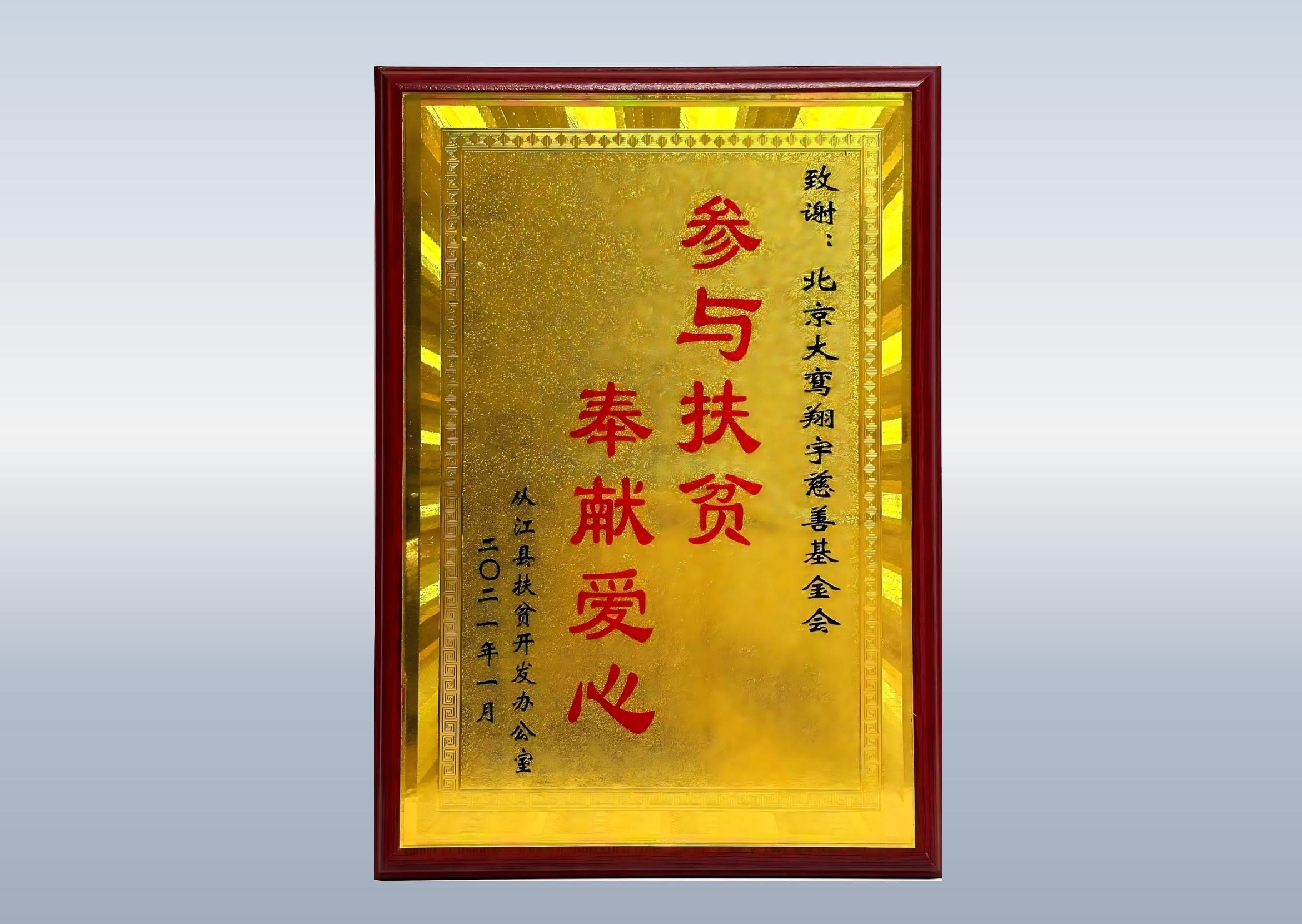“参与扶贫,奉献爱心”荣誉牌匾