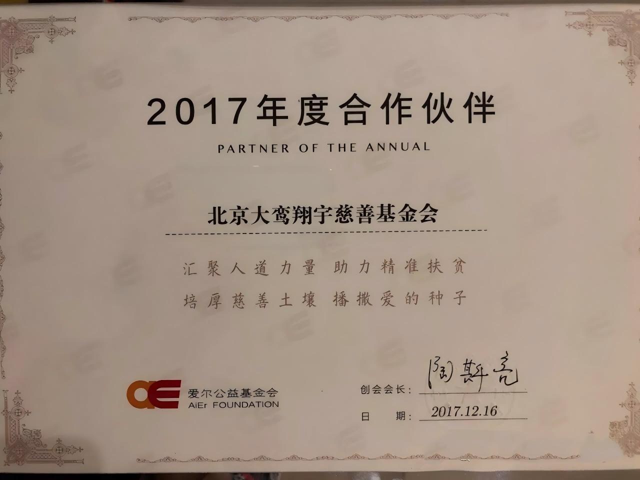 详情:“2017爱尔之夜”慈善活动,表彰了2017年度工作突出的机构和个人,北京大鸾翔宇慈善基金会被评为“2017年度合作伙伴”。