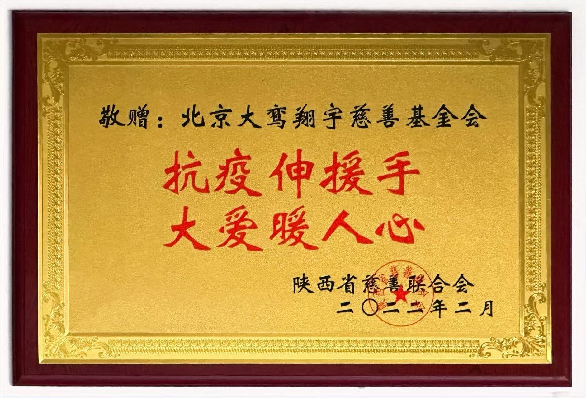详情:为致敬北京大鸾翔宇慈善基金会疫情期间作出的贡献,陕西省慈善联合会赠送“抗疫伸援手,大爱暖人心”荣誉牌匾。