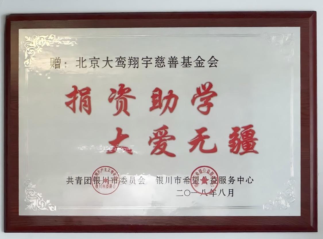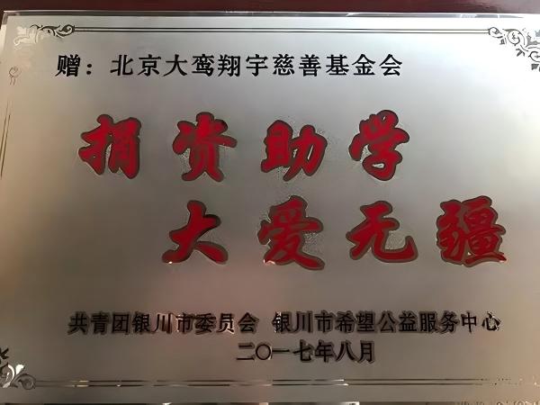 详情:2017年银川市“希望工程·圆梦行动”助学金发放仪式上,为感谢北京大鸾翔宇慈善基金会的捐赠,共青团银川市委员会、银川市希望公益服务中心向基金会回赠荣誉牌匾。