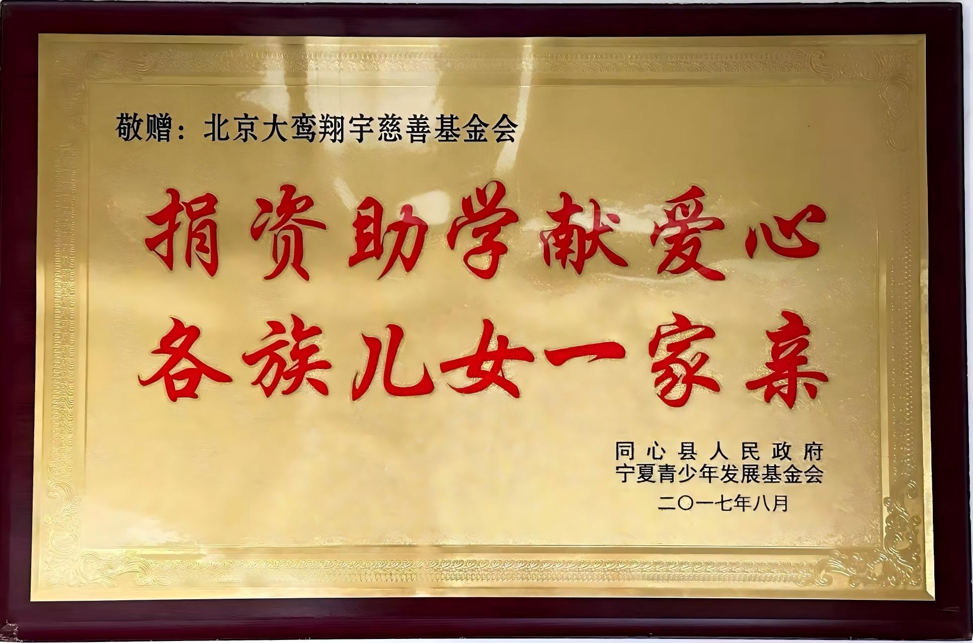 “捐资助学献爱心,各族儿女一家亲”荣誉牌匾