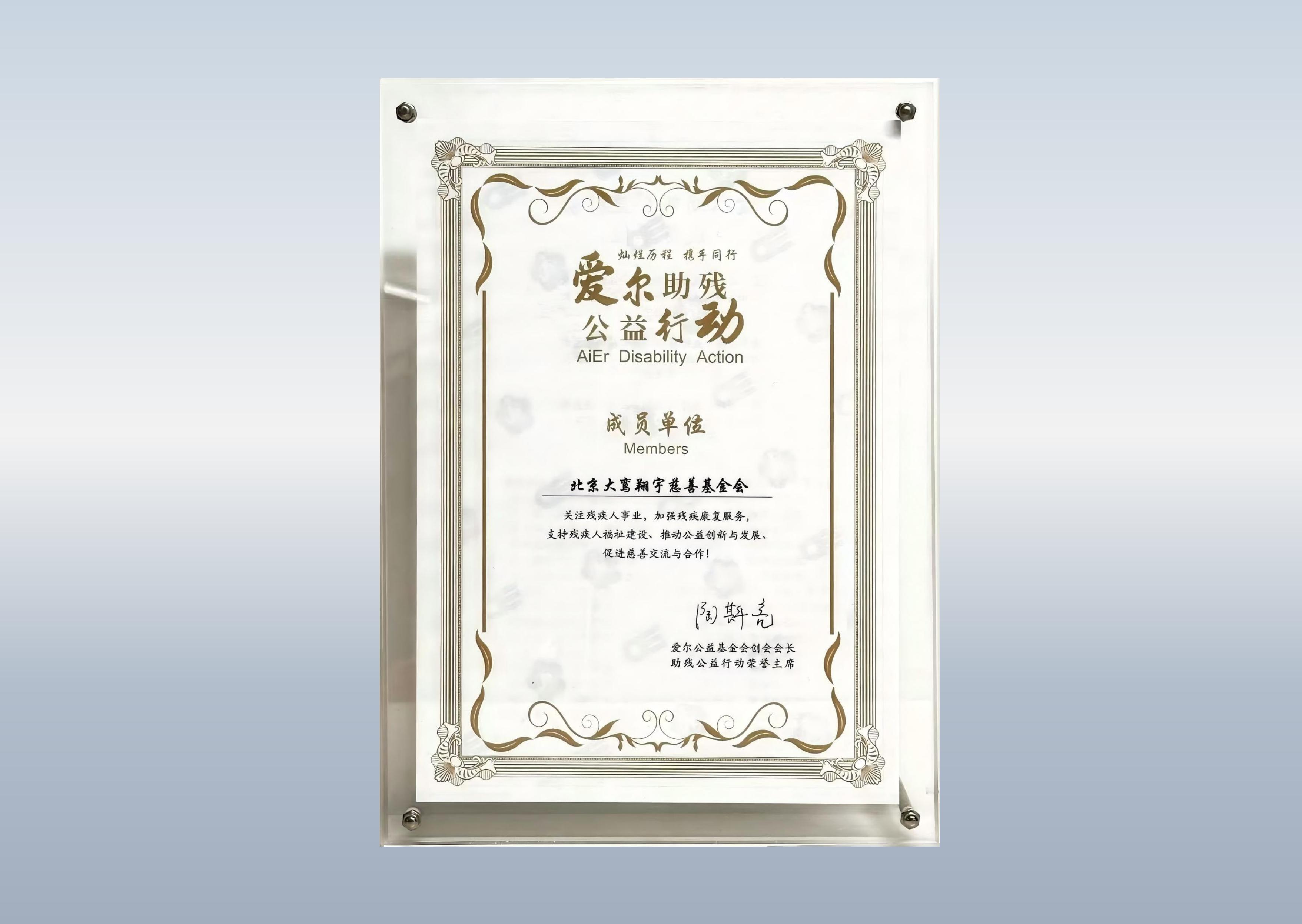 详情:由爱尔基金会主办的“灿烂历程,携手同行——第三届爱尔助残公益行动”中,北京大鸾翔宇慈善基金会被评为公益组织成员单位。