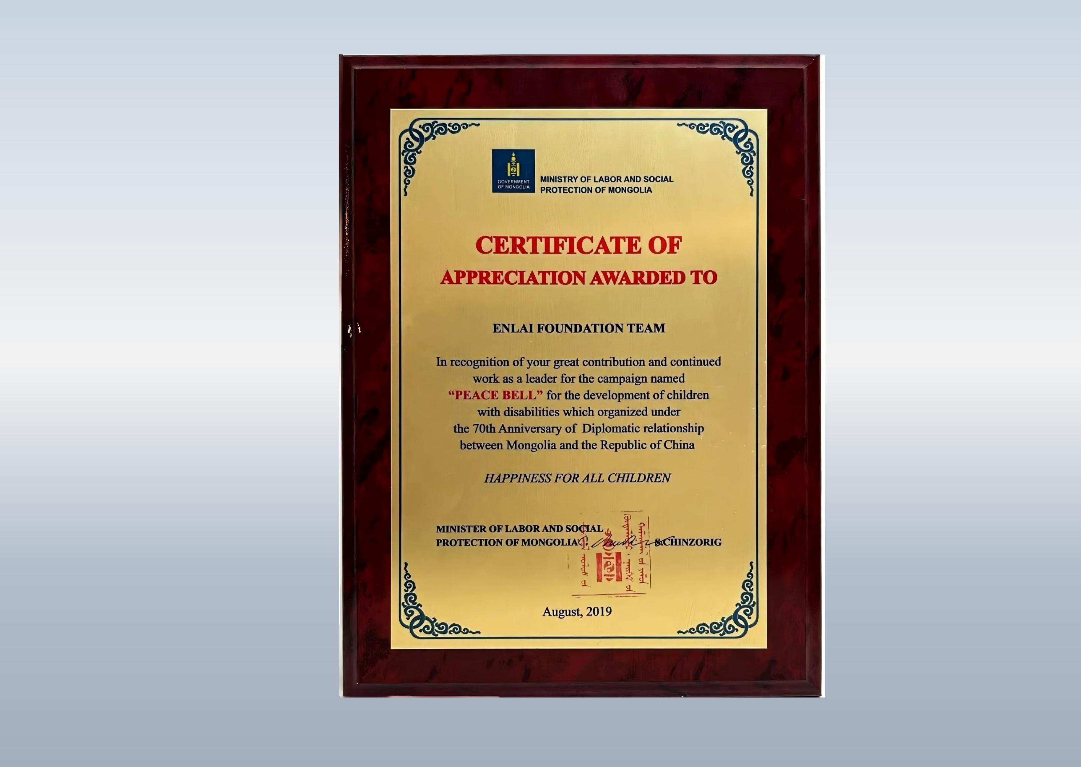 详情:蒙古劳动和社会保护部为感谢北京大鸾翔宇慈善基金会作出的巨大贡献,又恰逢中蒙建交70周年,特颁发此感谢证书。