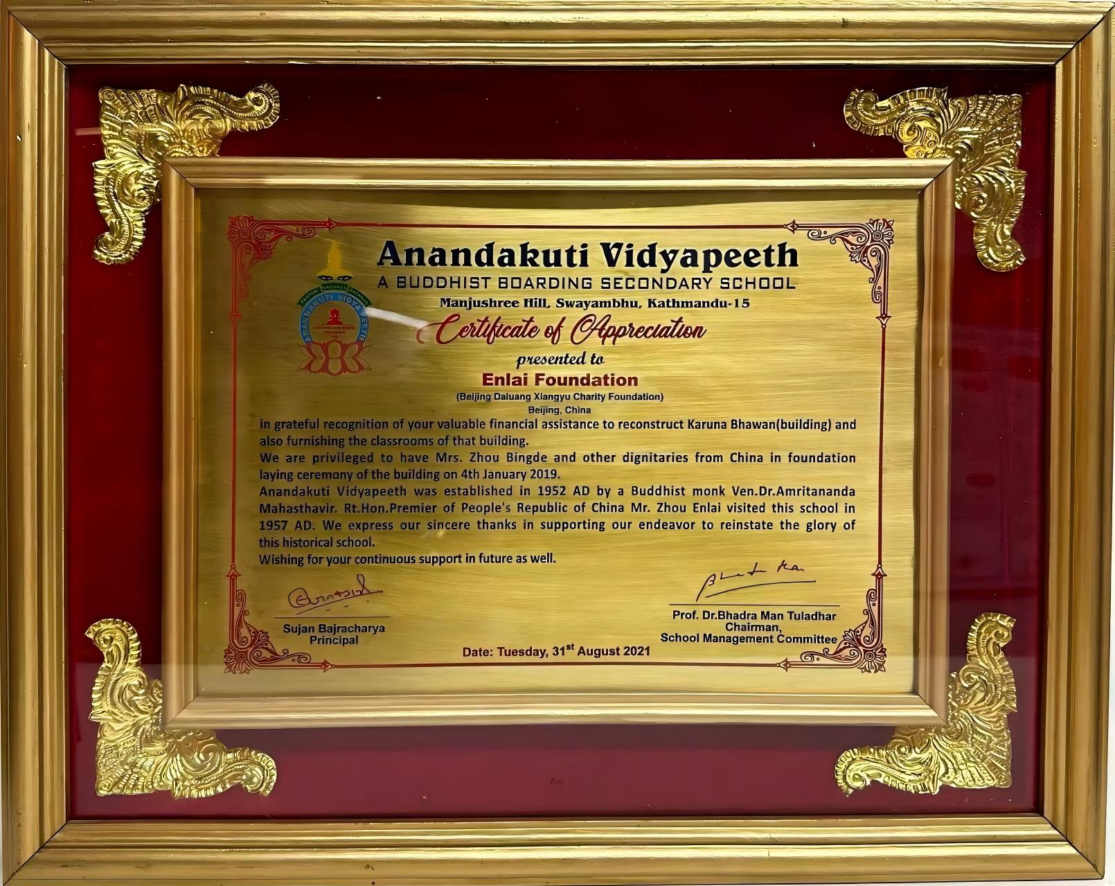 详情:阿南达库迪文理学校为感谢北京大鸾翔宇慈善基金会资助尼泊尔阿南达-库迪学校“悲悯楼”灾后重建,特颁发的感谢证书。