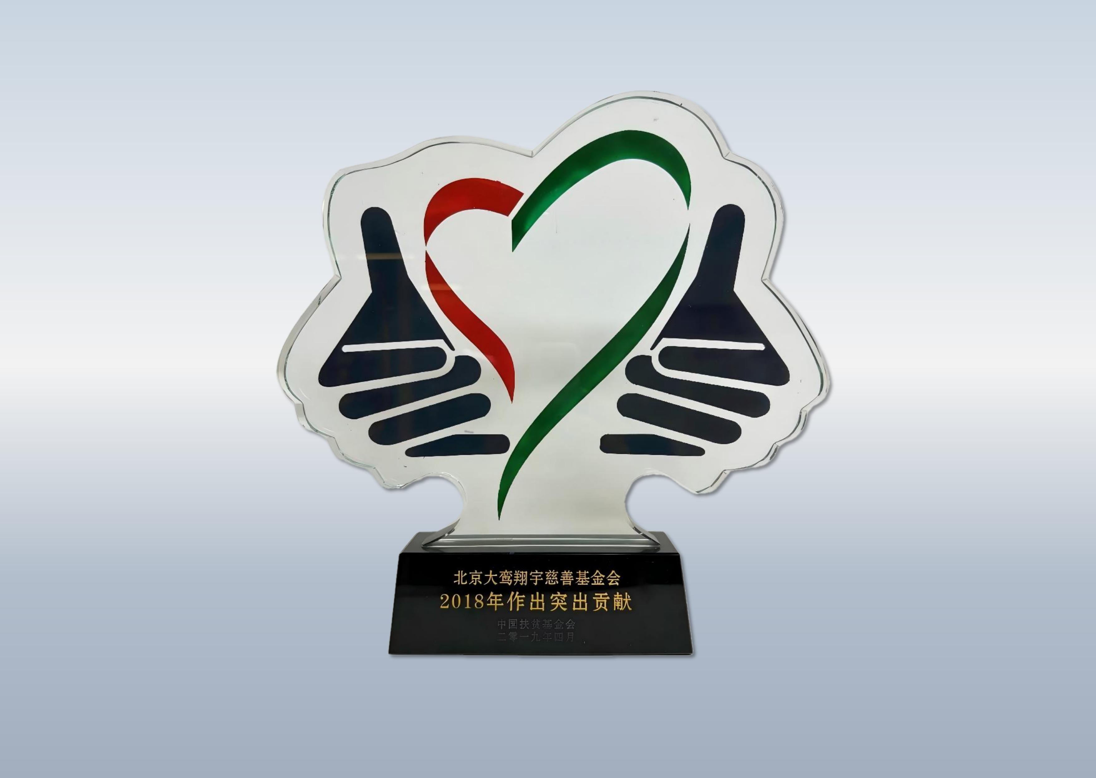 详情:北京大鸾翔宇慈善基金会成立以来一直与中国扶贫基金会(现中国乡村发展基金会)保持良好的合作关系。为表感谢,授予“五年爱心陪伴”纪念杯。