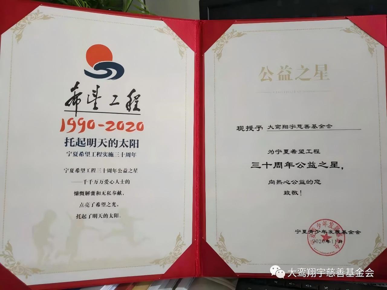 “宁夏希望工程三十周年公益之星”荣誉证书