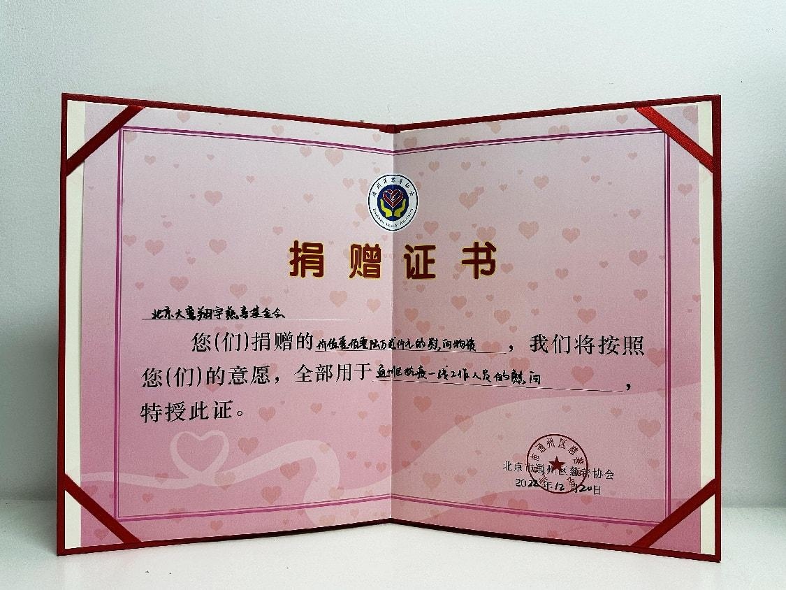 详情:北京大鸾翔宇慈善基金会向北京市通州区慈善协会捐赠价值106万抗议物资,北京市通州区慈善协会特颁发此捐赠证书。
